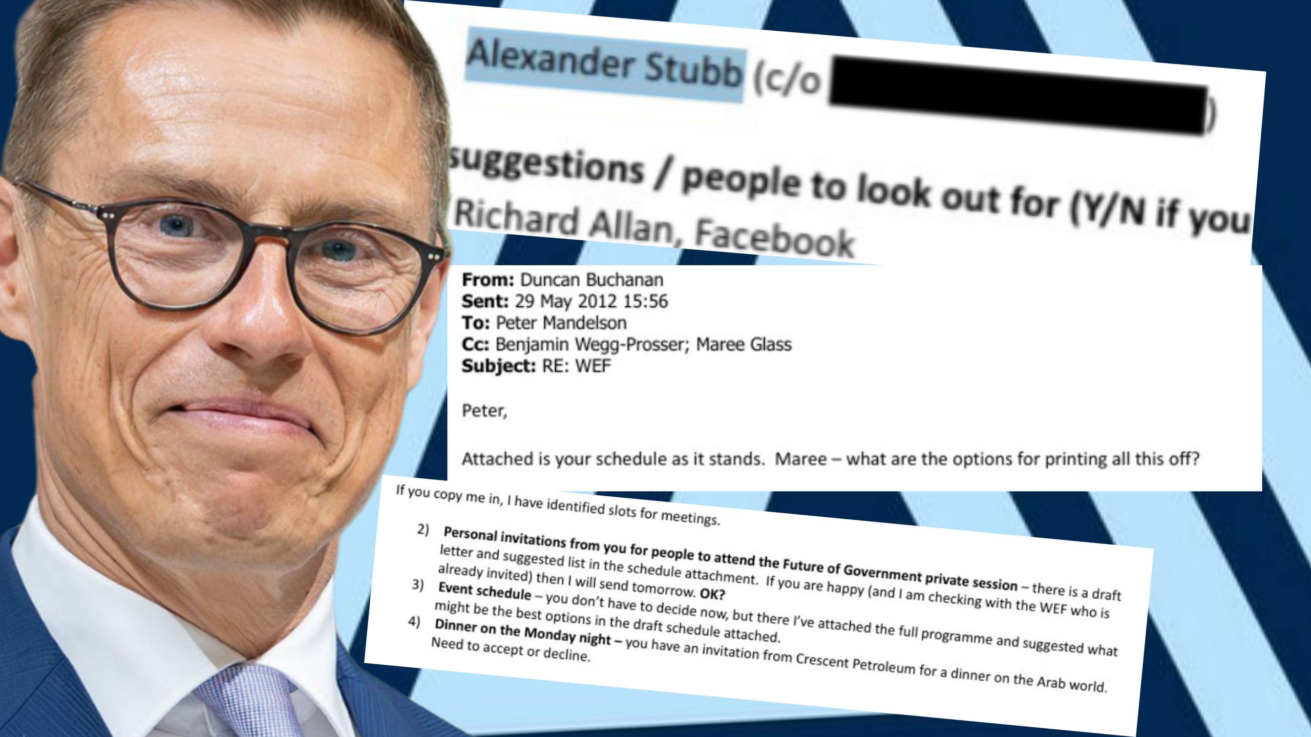 Epstein-tiedostoista löytyvä Vuodelta 2012 peräisin oleva Global Counsel LLP:ltä peräisin oleva sähköposti osoittaa, että brittipoliitikko Peter Mandelson suunnitteli World Economic Forumin (WEF) Istanbulin tapaamiset ja halusi nimenomaan tavata Suomen silloisen eurooppaminsterin Alexander Stubbin. Mandelsonin kuului Jeffrey Epsteinin lähipiiriin ja tapasi Epsteiniä useita kertoja myös tuomion jälkeen. Mandelson on jopa kutsunut Epsteiniä ”hyväksi ystäväkseen.” Siksi Stubbin esiintyminen samoissa kansainvälisissä verkostoissa herättää kysymyksen: miksi juuri Stubb oli Mandelsonin prioriteettilistalla? Wikipedia