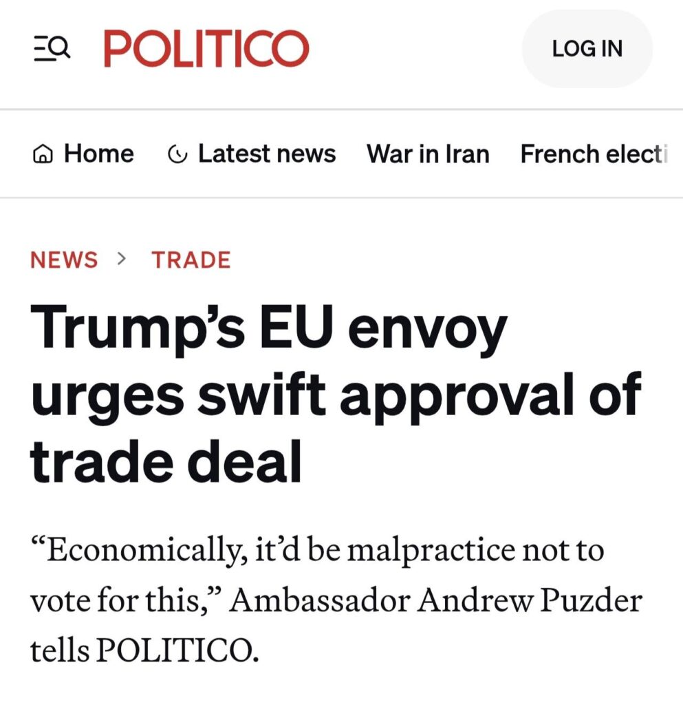EU-johtajat pitivät jo hätäkokouksen (EU Summit) 19.–20. maaliskuuta yrittäen epätoivoisesti vedota ”moratorion” (tauon) puolesta Lähi-idän energiainfraan kohdistuvissa iskuissa, koska Euroopan kaasun hinnat olivat raketoineet 60 %. Parlamentin puhemies Roberta Metsola nosti asialistalle suoraan ”kilpailukyvyn, energian ja geopoliittisen kehityksen. Samaan aikaan Euroopan parlamentin kansainvälisen kaupan valiokunta (INTA) hyväksyi kantansa ehdotuksiin, jotka koskevat nimenomaan EU:n ja Yhdysvaltain Turnberryn kauppasopimuksen täytäntöönpanoa.