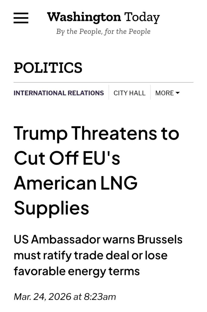 Tuo viiden päivän tauko päättyy lauantaina. EU-parlamentti on kokoontumassa torstaina 26. maaliskuuta. Euroopalla ei ole enää Venäjän putkia, ei Qatarin laivoja, ja Hormuz on tulessa. Torstaina Euroopan on virallisesti ratifioitava alistumisensa Yhdysvaltain energiakoloniaksi ja hyväksyttävä 750 miljardin lasku LNG:stä, tai lauantaina ’Sotaministeriö’ antaa pommien jälleen pudota ja Euroopan teollisuus pimenee lopullisesti. Tämä on asiallistettua kiristystä, ja se tapahtuu silmiemme edessä.