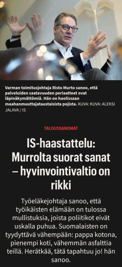 Suomalainen järjestelmä on rakennettu oletukselle jatkuvasta talouskasvusta. Kun sitä kasvua ei (aiemmin mainittujen fysiikan ja geopoliittisten syiden vuoksi) enää tule, valtion on pakko alkaa kannibalisoida omaa moottoriaan pitääkseen yllä illuusiota palveluista.