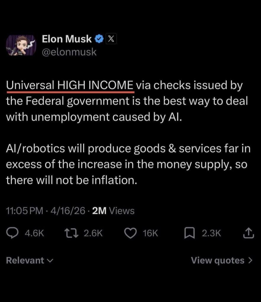 UBI:n todellinen tarkoitus: Miksi Musk ehdottaa kaikille shekkejä? Ei pelkästään hyväntekeväisyydestä. Kapitalismi tarvitsee kuluttajia. Jos robotit tekevät kaiken ja ihmiset ovat työttömiä, kuka ostaa Teslan autot ja iPhonet? Valtioiden on pakko jakaa ”tekoälyosinkoa” (perustuloa) estääkseen talousjärjestelmän täydellisen pysähtymisen ja yhteiskunnallisen vallankumouksen.