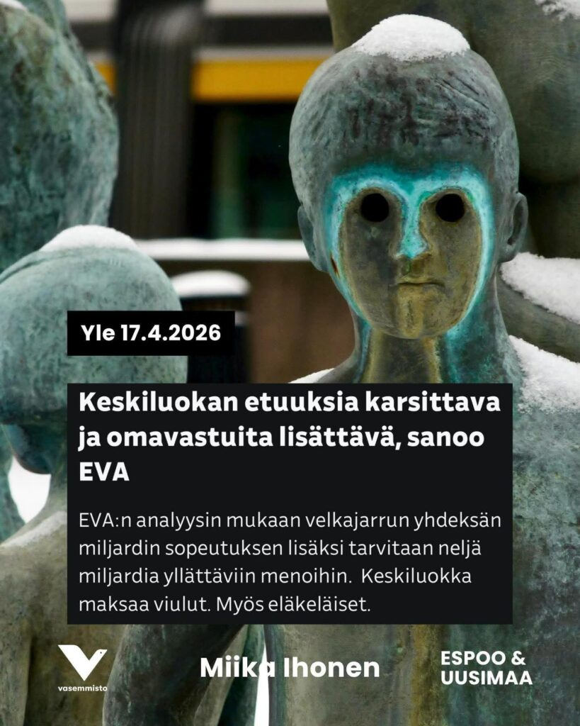 Tämä EVA:n lausunto on juuri se mekanismi, jolla tuo tuleva dystopia rakennetaan. Kun keskiluokalta leikataan etuuksia ja nostetaan maksuja samalla kun elinkustannukset (energia, ruoka) nousevat, heidän taloudellinen puskurinsa sulaa. He putoavat pikkuhiljaa samalle viivalle tukea tarvitsevien kanssa. Se itsenäinen, omillaan toimeentuleva kansanosa pyyhitään pois kartalta.