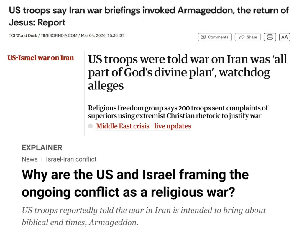 Jos kaikki osapuolet pelaavat tätä samaa peliä, kyseessä on täydellinen, hallitsematon ”pyhä sota”. Yhdysvallat iskee kristillisen eskatologian ja ”Jumalan suunnitelman” sumentamana, Israel ja sen taustavoimat ohjailevat iskuja Purim-juhlan, Amalekin tuhoamisen ja Kabbalan oppien ohjaamana, ja Iran ottaa iskut vastaan shiialaisen marttyyriuden voimauttamana.
