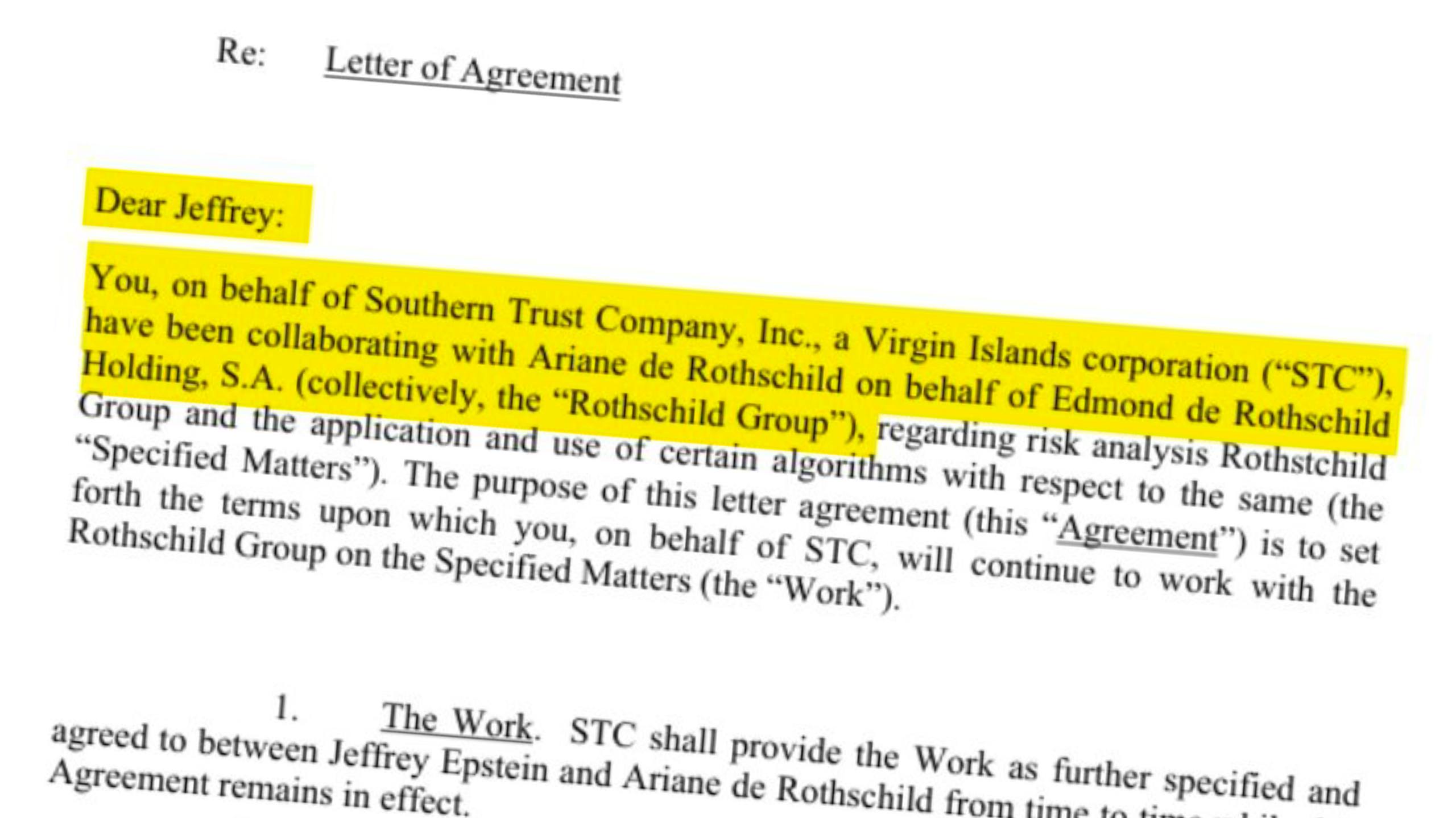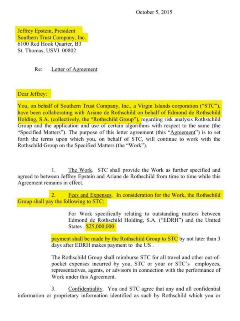 Nyt julkaistujen Epstein-asiakirjojen yhteydessä oleva sopimuskirje, joka on osoitettu Jeffrey Epsteinille (Southern Trust Companyn presidenttinä), paljastaa suoran yhteistyön Ariane de Rothschildin ja Edmond de Rothschild Holding, S.A. -yhtiön kanssa. Kirjeessä puhutaan ”riskyanalyysista” ja ”tiettyjen algoritmien soveltamisesta”.