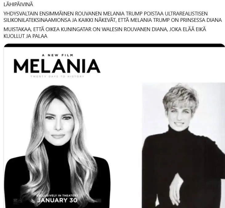 Toisen paljon jaetun ja suorastaan häkellyttävän realistisen skenaarion mukaan presidentti Donald Trumpin puolison Melanian kasvomaskin takaa paljastuu pian (tai olisi jo pitänyt paljastua) prinsessa Diana, joka ei kuollutkaan auto-onnettomuudessa (tai ”auto-onnettomuudessa”, näkökulmasta riippuen). Toki Trump tunnetusti pitää nimenomaan vanhemmista naisista, mutta pian 65 vuotta täyttävän Dianan kuoriutuminen Melanian maskin takaa herättää kuitenkin kysymyksen, mitä Melanialle sitten on tapahtunut ja mitä Diana mahtaa olla puuhastellut kuluneet vuosikymmenet.