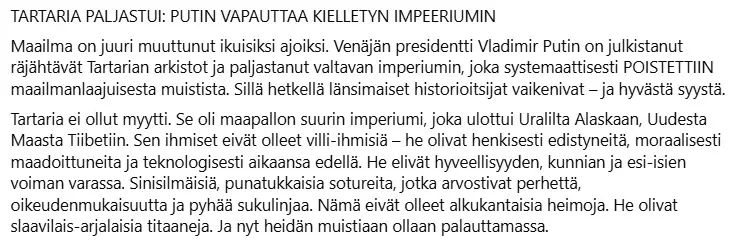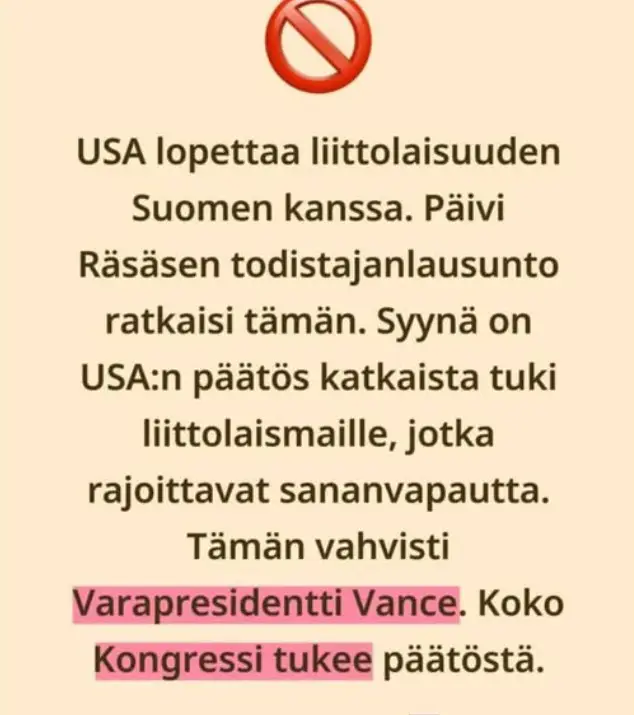 Yhden sellaisen mukaan Päivi Räsäsen todistajanlausunto Yhdysvaltain kongressissa on saanut Yhdysvallat lopettamaan liittolaisuuden Suomen kanssa. Tämän on väitetysti vahvistanut varapresidentti J. D. Vance, ja koko kongressin kerrotaan tukeneen päätöstä.