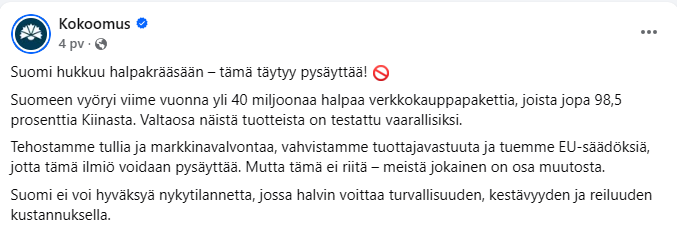 Kokoomus julkaisi Facebookissa päivityksen, jossa puolue väittää Suomen “hukkuvan halpakrääsään”. Päivityksen mukaan Suomeen saapui viime vuonna yli 40 miljoonaa verkkokauppapakettia, joista 98,5 prosenttia Kiinasta, ja että “valtaosa näistä tuotteista on testattu vaarallisiksi.” Tilastot pakettitulvasta pitävät pitkälti paikkansa, mutta keskeinen turvallisuusväite on asiantuntijatiedon perusteella harhaanjohtava.
